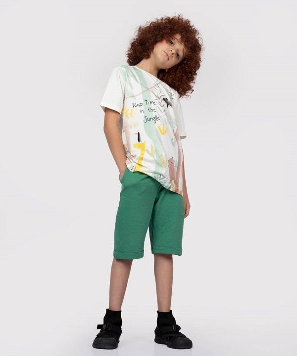 یکی از ویژگی های برجسته ی ست راحتی تابستانه طرح جنگل، طراحی جذاب آن است. تیشرت این ست، با چاپی شاد و کودکانه از حیوانات جنگلی مانند زرافه، خرس، پرندگان و پاندا، حس بازی در دل طبیعت را برای کودک تداعی می کند. همچنین، جمله ی “Nap Time in the Jungle” که روی تیشرت نوشته شده، فضایی فانتزی و لطیف را ایجاد کرده و تداعی کننده ی حس آرامش و استراحت در میان ماجراجویی های کودکانه است.